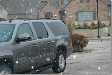 It is snowing like crazy outside! It’s insane because yesterday we were all running around in t-shirts, and now snow!! It’s been snowing about an hour and doesn’t appear to really be sticking, but it’s still fun and crazy we’re seeing snow in Texas!